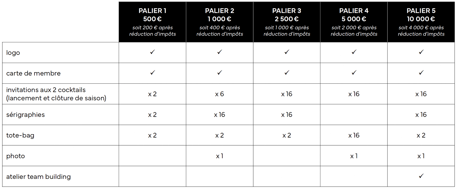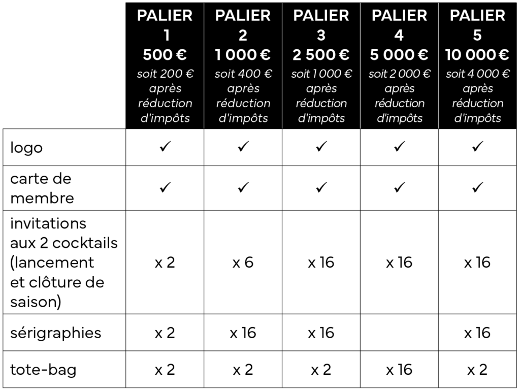 Le tableau ci-dessous détaille les paliers de dons possibles à réaliser et les contreparties qui vous seront offertes (en tant qu’entreprise, contactez-nous pour établir une convention mécénat). Si elles répondent précisément aux préconisations prévues par les services fiscaux, elles nous permettent surtout de créer les liens qui jalonneront notre aventure commune artistique et surtout humaine !